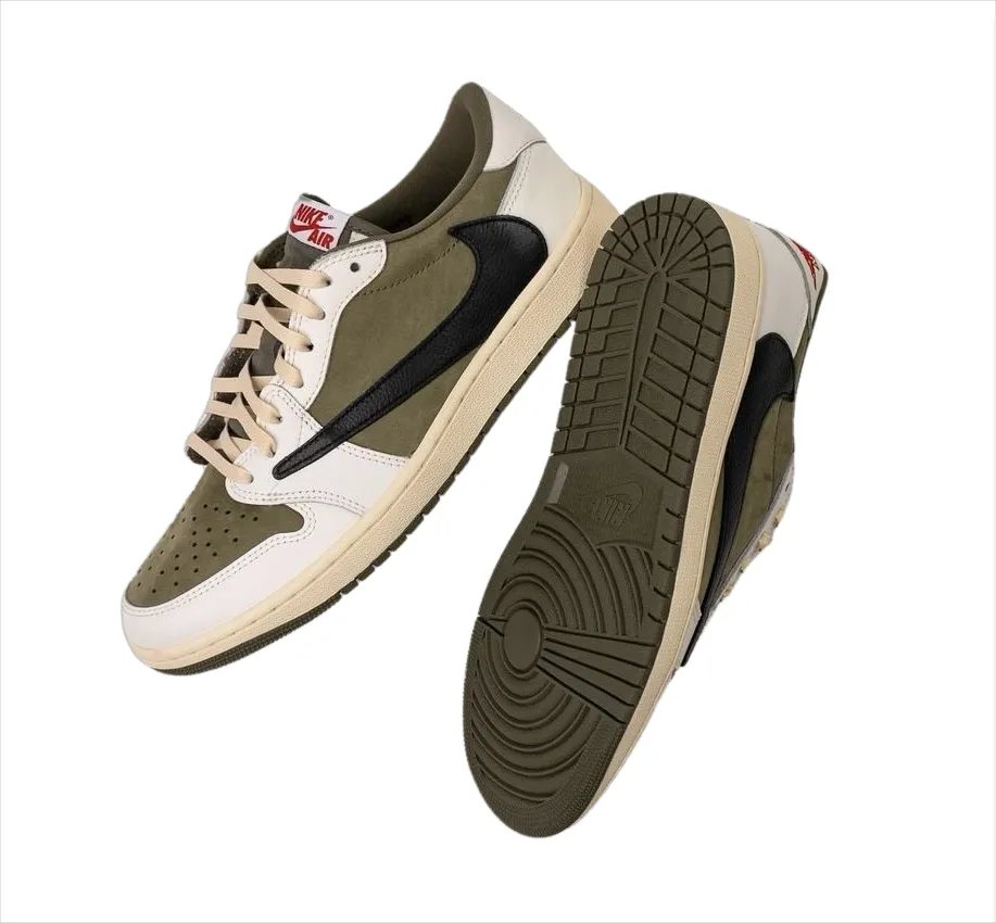 Air Jordan 1 Retro High OG SP 'Travis Scott Mocha' (2019) Uno de los modelos más icónicos, con un diseño de cuero blanco y gamuza Mocha, famoso por el Swoosh invertido. |